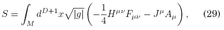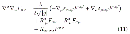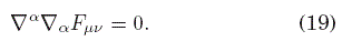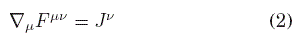 donde Fμν=∇μ Aν−∇ν Aμ=∂μ Aν−∂ν Aμ es el tensor de campo, definido a partir de la 1-forma A=Aα dxα ∈ T*M, la cual puede verse como una sección del haz de fibras cotangente de la variedad espacio-temporal M, g es el tensor métrico de signatura (+,−,...,−) que estará determinado por las ecuaciones de campo de Einstein, aunque más adelante supondremos que está dado, y que la presencia del campo eléctrico no perturba significativamente al campo gravitacional; y J es el vector de densidad de corriente asociado a posibles fuentes del campo electromagnético. Por otro lado, de la definición de F, se tiene la siguiente identidad