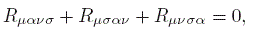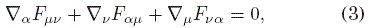 que recibe el nombre de identidad de Bianchi de la teoría, y reproduce las ecuaciones de Maxwell inhomogéneas. Esta identidad puede escribirse igualmente reemplazando las derivadas covariantes por derivadas parciales, debido a la propiedad de simetría de la conexión de Christoffel con que se ha equipado a la variedad diferencial M, y la antisimetría del tensor de campo.