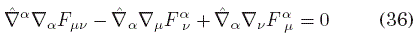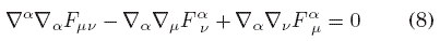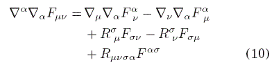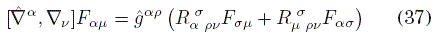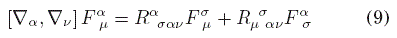 donde hemos usado la condición de metricidad ∇αgμν= 0 y la antisimetría de F. Ahora, las derivadas covariantes en general no conmutan, sino que
