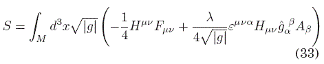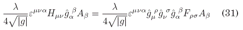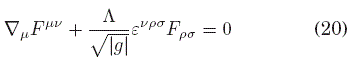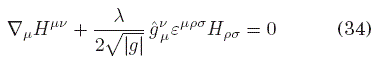 mientras que, si (31) fuese un auténtico término topológico, su derivada funcional respecto de la métrica debería ser nula, dado que tales términos no contribuyen al tensor energía-momento que eventualmente perturbaría al campo gravitacional. Sin embargo, es evidente que para κ = 0, se recupera la invariancia topológica, con lo que podemos decir que tal carácter es un límite de la teoría más general descrita por la acción