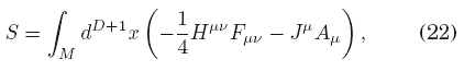 que es análogo a los campos vectoriales auxiliares D y H de la electrodinámica en medios en 3+1 dimensiones. Note el uso de la métrica óptica en esta definición. Por otro lado, la corriente Jμ corres-ponde solo a las llamadas corrientes libres, y no así a la corriente ligada, producida en los componentes de medio por su interacción con el campo electromagnético.