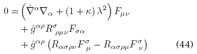 Luego, al sustituir las derivadas cruzadas de (36) usando el conmutador (37), sustituyendo los términos que tengan divergencias del tensor F con la ecuación (39), usando nuevamente la definición del dual y sustituyendo el resultado de (43), el resultado final para la generalización de la ecuación de Klein-Gordon en un espacio-tiempo arbitrario en presencia de un medio óptico es