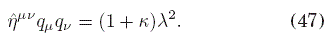 de donde podemos concluir que, como en el caso del trabajo de Deser et al. , [1982], las excitaciones del campo son masivas, pero ahora el valor de la masa del campo es directamente proporcional al valor de las constantes ópticas del medio a través de κ = με−1=n2−1 > −1, donde n es el índice de refracción en reposo del medio óptico. Por otro lado, en el caso en que λ = 0, se tiene que la propagación del campo, en lugar de ser a través de geodésicas nulas en el espacio-tiempo de fondo, tiene lugar en geodésicas nulas de una nueva geometría Rieman-niana efectiva descrita por