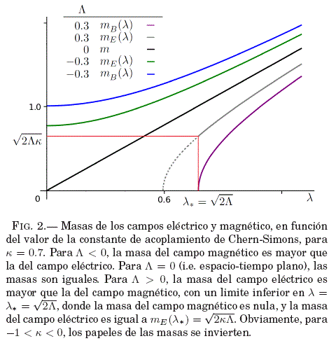 Es claro que existe una asimetría en el valor de las masas. Evidentemente, para un valor negativo de la constante cosmológica y para k > 0, la masa del campo magnético es mayor que la masa del campo eléctrico, y en este regimen, todos los valores de la constante de acoplamiento λ de Chern-Simons están permitidos; mientras que, para un valor positivo de la constante cosmológica, la constante de acoplamiento se restringe a λ2 ≥ 2Λ, y aquí tendremos que la masa del campo eléctrico será mayor que la del campo magnético (ver Figura 2). Esos resultados sugieren una asimetría fundamental entre las partes eléctrica y magnética del tensor de campo, la cual se manifiesta no solo en el carácter tensorial de ambas partes en dimensiones diferentes a 3+1 (en 2+1, que es nuestro caso, el campo eléctrico es un 3-vector, mientras que el campo magnético es un campo escalar), sino que sus características inerciales son diferentes también, cuando interactúan con un medio óptico simple no-dispersivo, habiéndose considerado previamente la corrección de pseudo-Chern-Simons. Tal vez podría esperarse que para λ = 0 y constante cosmológica negativa, se recupere la simetría de masas; sin embargo, eso no sucede: aún si despreciamos la contribución pseudo-topológica (i.e., estudiamos la teoría de Maxwell solamente), encontraremos una asimetría en las masas de las partes eléctrica y magnética, como puede verse en las ordenadas en el origen de las curvas correspondientes a constante cosmológica positiva en la figura 2. A medida que el valor de κ se reduce acercándose a cero, la diferencia de masas se reduce, y cuando κ = 0, se recuperan los resultados de, por ejemplo, la figura 1, o también, la ecuación (48) se reduce a la ecuación (18). Los valores de las masas en este escenario son
