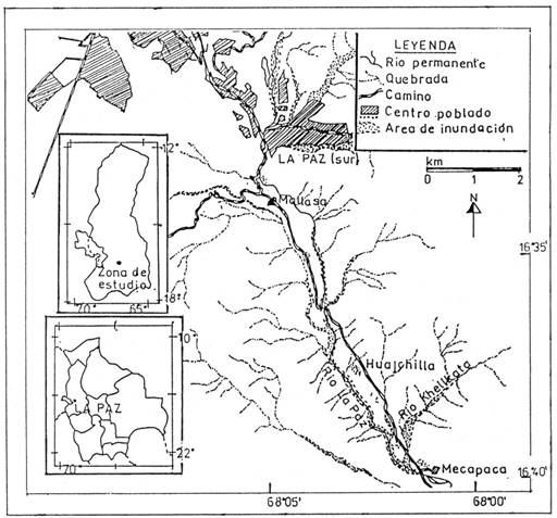 El área de estudio se encuentra en el valle de La Paz, el cual está situado en el departamento del mismo nombre con una altura promedio de 3.700 m snm dentro de las cadenas montañosas que constituyen la Cordillera de los Andes; el valle tiene una orientación norte-sud, con un drenaje hacia la cuenca amazónica. Huajchilla se encuentra ubicada a 17 km al sur de la ciudad, en el margen izquierdo del río La Paz, con las coordenadas geográficas: 68°03’O y 16°37’S (Fig. 1) y a 3050 m snm.