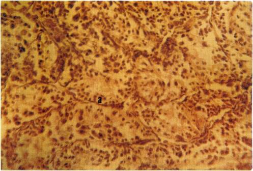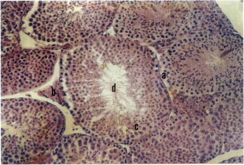 En este corte se evidencia la túnica albúginea (a) en la base de los túbulos seminíferos y varias células intersticiales (b). El lumen abierto (d) es indicativo de la madurez sexual y la variedad de tipos celulares (c) son indicativos de que la espermatogéniesis se lleva a cabo (Descripción basada en Reith y Ross, 1985).