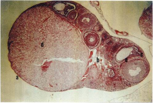 Puede evidenciarse la superficie del ovario compuesta por epitelio cúbico simple (a), debajo de éste la túnica albugínea (tejido conectivo) que se continúa con el estroma ovárico. La parte medular (b) consta principalmente de estroma. La parte cortical (c) tiene folículos abundantes, en diferentes fases de desarrollo, que se mueven hacia la región medular. Se evidencia la presencia de un cuerpo lúteo (d) y dos folículos de De Graff (Descripción basada en Reith y Ross, 1985).