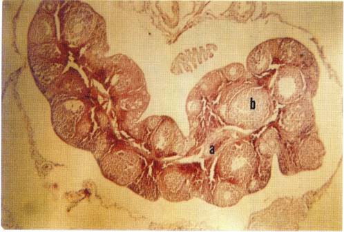 Se observa una región medular estrecha con abundantes vasos sanguíneos (a) y la región cortical (b) con numerosos folículos en estadios iniciales de maduración (Descripción basada en Reith y Ross, 1985).