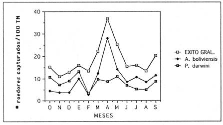 En lo referente a P. darwini, no existe gran variación en cuanto al éxito de captura a lo largo del año, teniendo sus valores más altos en los meses de enero, abril y mayo. Por el contrario, en el caso de A. boliviensis, existe una gran diferencia en el éxito de captura que explica las diferencias observadas en el éxito general. El hecho de un mayor éxito de trampeo en los meses de abril hasta septiembre, se debe a la mayor proporción de individuos juveniles en la población.