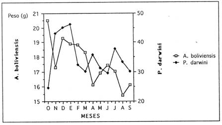 A fin de determinar la madurez sexual de los individuos de las poblaciones estudiadas, se obtuvo el promedio mensual del peso corporal por especie. Estos resultados están resumidos en la figura 3.