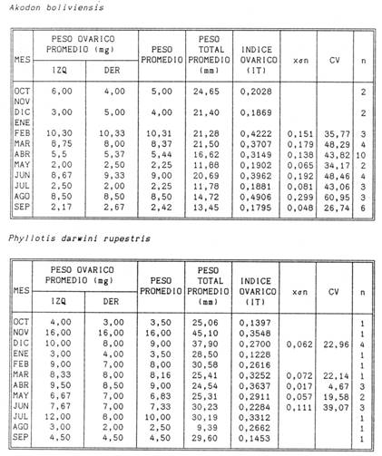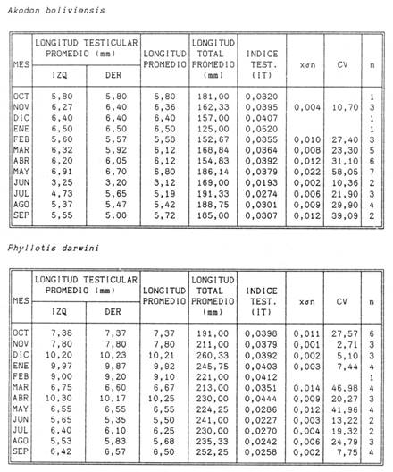 Para analizar el desarrollo del tamaño de los testículos obtuvimos el índice testicular, que se presenta en la tabla 3. En el caso de A. boliviensis, el desarrollo del tamaño testicular muestra diferencias entre una época de actividad reproductora y una época de inactividad, donde el tamaño de los testículos se reduce. La época donde los testículos son más grandes corresponde a los meses comprendidos entre octubre a mayo, para luego observar una reducción de tamaño entre los meses de junio a septiembre. El máximo valor del índice testicular fue observado durante el mes de enero, el menor en junio. El desarrollo del tamaño de los testículos en P. darwini nos muestra una variación más clara. El máximo valor del índice testicular fue observado durante el mes de abril, el menor se registró también en junio.