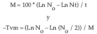 Donde, Nt es el número de sobrevivientes de una población al final de un periodo de tiempo t, No es el número inicial de individuos, Tvm es el tiempo de vida media y M es la tasa de mortalidad ajustada al modelo.