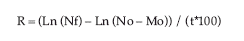 Donde, R es la tasa anual de reclutamiento expresada en porcentaje, No es el número inicial de individuos, Nf es el número final de individuos registrados, Mo es el número de árboles muertos y t es el tiempo.