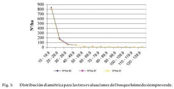 La estructura de ambos tipos de bosque no cambia, como se observa en la distribución diamétrica de las tres evaluaciones. Los individuos muertos y que ascendieron a la clase inmediata superior son reemplazados por aquellos reclutados, que mantienen la estructura del bosque y muestran que la dinámica de estos bosques es determinada por la mortalidad (claros), el reclutamiento y el crecimiento en las diferentes clases diamétricas.
