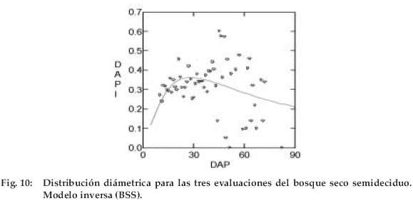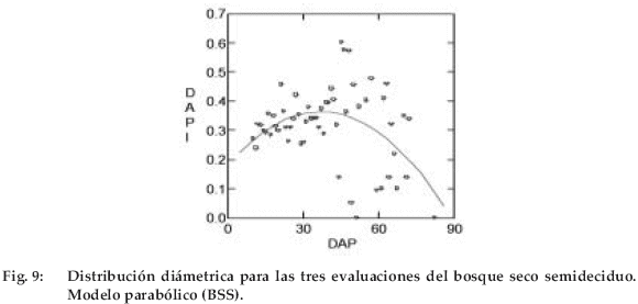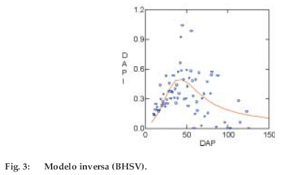 Las curvas ajustadas en función a los modelos inverso y parabólico muestran que el mayor crecimiento se da en las primeras clases diamétricas y luego llegan a un máximo para después descender lentamente (Figuras 9 y 10).