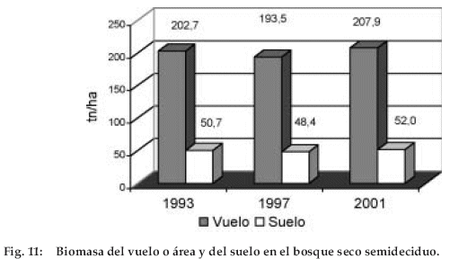 El BSS almacena 259.85 tn de biomasa por hectárea del total, 207.85 tn se encuentra en la parte aérea o vuelo y 52 tn en el suelo, presentando una disminución de biomasa en 1997 a causa de un incendio (Figura 11).