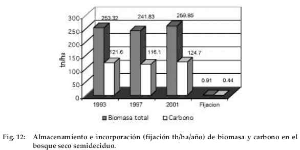 En este tipo de bosque se almacenan 259.8 tn de biomasa, que contienen 124.73 tn de carbono. En Cerro Pelao, el BSS tiene una incorporación de 0.91 tn/ha/año de biomasa con 0.44 tn de carbono, lo cual muestra que el BSS es un sumidero de carbono (Figura 12).