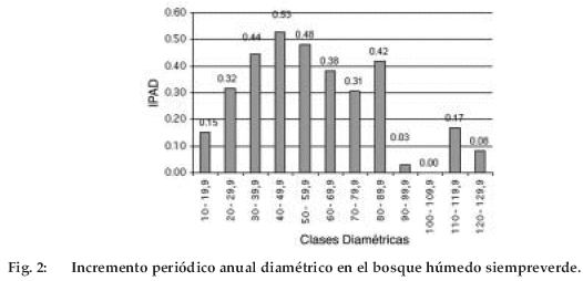 En el BHSV se registró un IPAD promedio de 0.24 cm/año y un IPAD máximo de 2.02 cm/ año. La figura 2 muestra que el mayor IPAD promedio es de 0.53 cm/año, registrado en la clase diamétrica 40-49.9, seguido de la clase 50-59.9 con un IPAD promedio de 0.48 cm/año. La clase que presentó menor IPAD fue la clase 100-109.9, mientras que la clase 100–109.9 permaneció sin incremento.