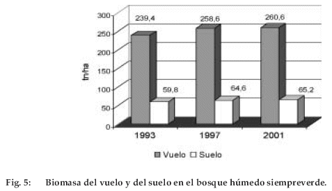 Igualmente se estimó la proporción de agua en la biomasa viva, la cual es del 40%, basado en la deshidratación total de 38 árboles y comprobado por Phillips et al. (1998), mediante la deshidratación parcial de 100 árboles en nueve sitios de la Amazonía. Por lo tanto, la biomasa seca del vuelo o aérea (BSDV) se determinó multiplicando la biomasa aérea total por 0.6. La proporción de la biomasa del suelo en los bosques tropicales es de 3:1, basado en el valor medio de tres estudios realizados en la Amazonía brasileña y en otros sitios (Fearnside 1994, 1997). Posteriormente se calculó el carbono fijado considerando los resultados del experimento de Carvallo et al. (1995, 1998) realizado en la Amazonía central (Manaus) y que sostiene que el 48% de la biomasa total está en forma de carbono.