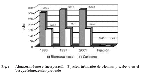 El BHSV presentó 299.20 tn/ha de biomasa en la primera medición, aumentando en la segunda a 323.20 tn/ha y a 325.79 tn/ha de biomasa en la tercera, lo que muestra una incorporación de biomasa seca de 3.43 tn/ha/ año con 1.65 tn de carbono. Por otro lado, el BSS presentó 253.20 tn/ha de biomasa en 1994 y 241.83 tn/ha en 1997; en 2001 aumentó a 259.85 tn por hectárea, lo que muestra una ligera disminución de 11 tn/ha en el primer intervalo, para luego tener un aumento de 18.20 tn/ha, dando una incorporación de biomasa de 0.91 tn/ha/año las que contienen 0.44 tn de carbono.