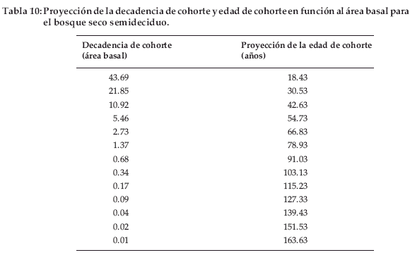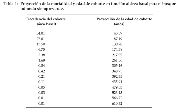 La decadencia de cohorte es una interesante forma de expresar la mortalidad, partiendo del supuesto en que la probabilidad de muerte es constante, no aumenta ni disminuye. La edad de cohorte es de 610.32 años, basada en la supuesta sobrevivencia del área basal de un individuo de 10 cm DAP (Tabla 4).