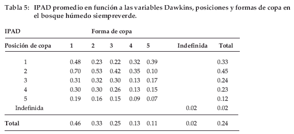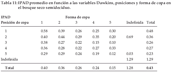 En función a las variables de Dawkins (posición y forma de copa), el mayor IPAD lo registran aquellos individuos de copa completa (1) y de posición dominante (1), seguidos por ambas interrelaciones de posición y forma de copa, mientras que los individuos de menor crecimiento son aquellos de copa suprimida (5) y poco follaje (5) (Tabla 11).