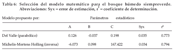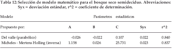El modelo seleccionado en este bosque es el parabólico, el cual fue determinado por el coeficiente de determinación de 0.84 y el error de estimación de 0.022 (Tabla 12).