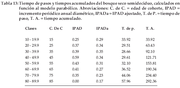 Los tiempos de paso y tiempos acumulados calculados en función a los incrementos ajustados por el modelo parabólico determinan que un individuo cualquiera requiere 292 años para llegar a la clase diamétrica superior (con 90 cm de DAP) y 122 años para llegar a los 50 cm de diámetro a la altura del pecho (Tabla 13).