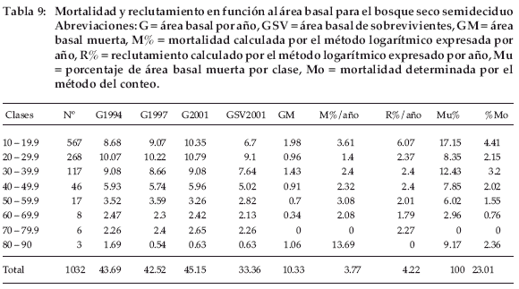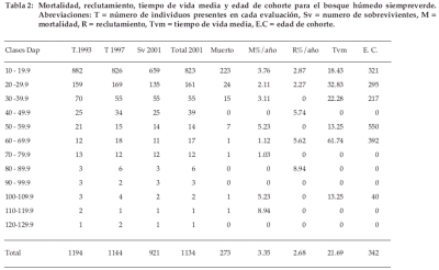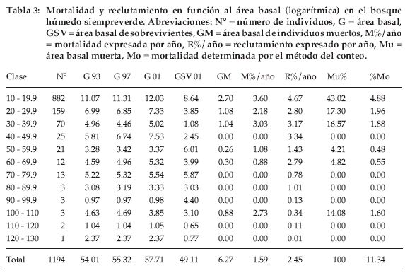 La mortalidad del área basal es de 1.59% por año y el reclutamiento es de 2.45% por año y del total de la mortalidad ocurrida en este bosque el 43.02% se produjo en la clase inferior, 17.3% por año en la segunda (20-29.9) y 16.57% en la tercera (30-39.9), esto muestra un mayor dinamismo de las clases inferiores respecto a las superiores (Tabla 3).