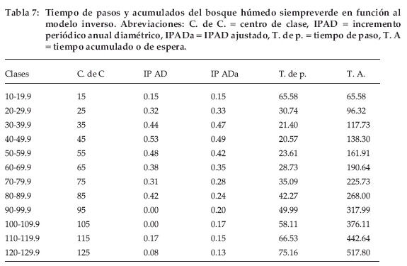 Los tiempos de paso y tiempos acumulados calculados en base a los incrementos ajustados en función al modelo de crecimiento seleccionado para este bosque, determinan que, para que un individuo cualquiera llegue a la clase diamétrica superior (con 130 cm de DAP) necesita 518 años y para que llegue a los 50 cm de diámetro necesita 138 años (Tabla 7).
