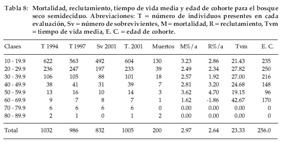 La mortalidad y reclutamiento (Tabla 2) están distribuidos en la mayoría de las clases diamétricas con altos índices de muertes e ingresos y a pesar de esto, las distribuciones diamétricas observadas en la fig. 1 permanecen casi inalteradas o con pequeñas modificaciones, que no dejan de ser una misma curva.