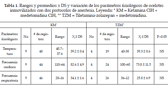 En dos ocasiones al aplicar el protocolo KM se tuvo que suplementar con ketamina (5 mg/ kg) después de la inyección inicial, debido a falla en un dardo y la otra por mal cálculo de peso del animal. En una tercera ocasión, el sistema de alarma de activado de la trampa no funcionó por un problema técnico de radiocollar y al no tener la certeza del tiempo de captura del animal y la elevada temperatura del ambiente al que había estado expuesto el ocelote, éste fue liberado. Los datos registrados de estos tres animales no se tomaron en cuenta para el presente análisis estadístico.