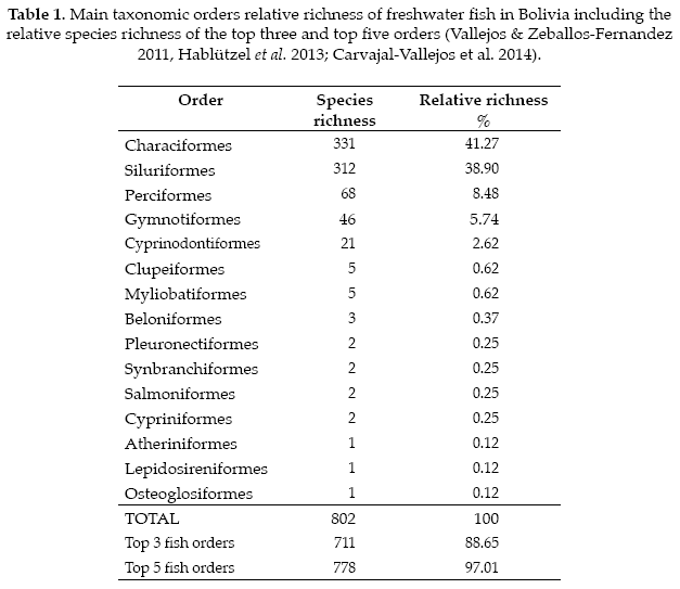 Fish are the most unknown of vertebrate groups in Bolivia and reflect the poor overall state of knowledge of aquatic diversity in the country (Carvajal-Vallejos et al. 2014). In the Amazon region of Bolivia, 802 fishes are known to science and new fishes are described annually (Habützel et al. 2013, Carvajal-Vallejos et al. 2014, Sarmiento et al. 2014). Possibly the most documented river of the Bolivian Amazon is the Mamoré (394 spp.), although the ichthyofauna of the river Iténez (430 spp.) is referred as the most diverse (Carvajal-Vallejos et al. 2014). Over 97% of the species fall within five major orders, Characiformes, Siluriformes, Perciformes, Gymnotiformes and Cyprinodontiformes (Table 1).
