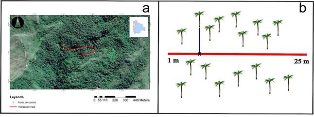Figura 1. Localización del sitio. a. Ubicación del sendero y puntos de muestreo, b. método de cuadrantes contiguos, donde la X representa el punto registrado para cada helecho sobre la línea de 25 m.