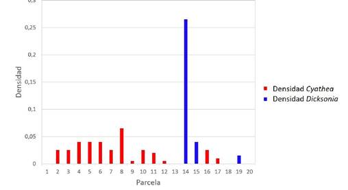 En este estudio comparamos la densidad y patrones de distribución de Dicksonia karsteniana con varias especies de Cyathea. La densidad de D. karsteniana fue similar a la alcanzada por varias especies de Cyathea en el sitio de estudio. Así mismo, nuestros resultados destacan el patrón de distribución fuertemente agregado de D. karsteniana, con una concentración del 95% de los individuos en solo dos parcelas (10% del área muestreada, Fig. 2). Dicho patrón estuvo relacionado positivamente con la humedad del suelo y la profundidad de la hojarasca y negativamente con la distancia a un arroyo. Nuestros resultados destacan la necesidad de conservar los ambientes cercanos a los arroyos para mantener las poblaciones de esta especie.
