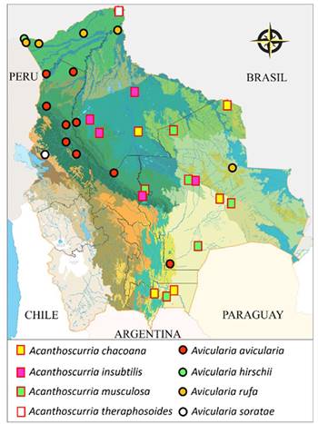 El conocimiento de la fauna en general en Bolivia aun es limitado, siendo los esfuerzos de investigación centrados principalmente a los vertebrados, sin embargo, los invertebrados constituyen el 90% de la fauna y a pesar de ello, el conocimiento es deficiente. Dentro de los arácnidos, la familia Theraphosidae, comúnmente conocidas en Bolivia como apasankas, pasankas, qampu, qampu kusi-kusi y globalmente como tarántulas. Esta primera contribución de los Theraphosidae de Bolivia incluye relevamientos de campo en sitios con vacíos de información y la adición de nuevos registros. Se han identificado 33 especies de tarántulas, incluyendo la adición de dos nuevos registros de géneros para el país. Las tarántulas son depredadores terrestres generalistas que brindan servicios ecosistémicos; son sensibles a los cambios en el entorno, especialistas en hábitat y por su vagilidad, pueden ser consideradas como especies indicadoras de la salud del ecosistema. Por lo que no es de extrañar que, debido a la diversidad de hábitats, en cada relevamiento se encuentren nuevos registros. Las amenazas sobre estas especies incluyen la destrucción y fragmentación del hábitat, uso de pesticidas, tráfico ilícito para el mercado de mascotas, además de los efectos del cambio climático. Es importante continuar con estudios sobre este grupo, dando énfasis a aquellas especies que se encuentran amenazadas por el tráfico ilegal. De las tarántulas registradas para Bolivia, el 45% (n=15) de las especies son ofertadas en diferentes páginas de internet, el 53%, tiene alta demanda, el 27% mediana y el 20% poca demanda.