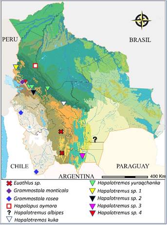 Se han registrado 33 especies en 17 géneros de la Familia Theraphosidae (Fig. 1), de las cuales seis son posibles nuevas especies para la ciencia, incluyendo el registro de dos géneros para el país, Bistriopelma y Euathlus (Tabla 1). A continuación, se presentan: 1) La lista actualizada de especies de tarántulas de Bolivia (Tabla 1 y mapas de distribución), 2) descripción general de las especies y 3) las amenazas y observaciones sobre la conservación de las especies de tarántulas. Se registraron 16 especies endémicas para Bolivia. El género con mayor número de endemismo es Hapalotremus con un total de siete especies, incluyendo cuatro aún no descritas (Tabla 1).