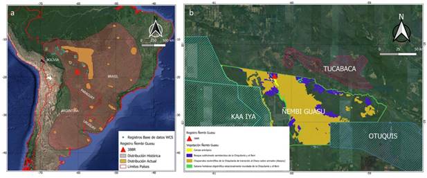 Figura 1. Distribución de Ozotoceros bezoarticus. a. histórica Castro et al. 2021) y actual Gonzáles et al. 2016 en América del Sur y registros de la especie en Bolivia (Wallace et al. 2013), b. mapa de vegetación del Área de Conservación e Importancia Ecológica Nembi Guasu Navarro & Maldonado 2002,Navarro 2011.