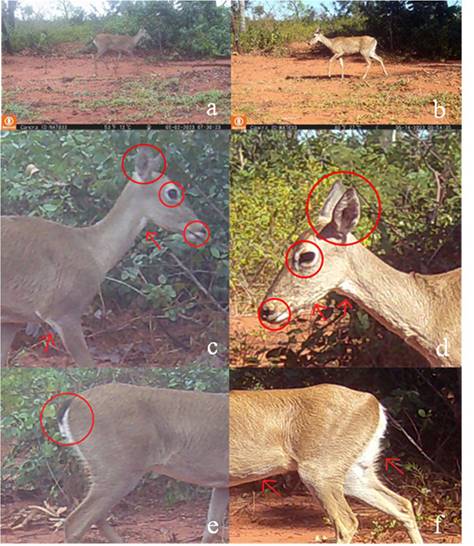 Figura 2. a. Primer registro de Ozotoceros bezoarticus del 02/05/2023, b. Segundo registro del 14/05/2023, c. y d. muestran detalles de pelaje blanco en los labios, al interior de las orejas, alrededor de los ojos, en la garganta y en la parte ventral de las patas, e. y f. muestran detalles de pelaje blanco debajo de la cola y en los glúteos.