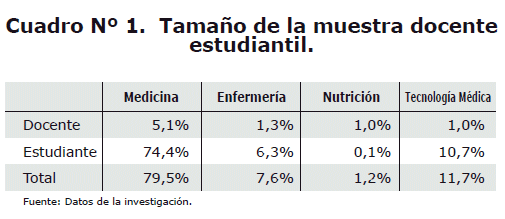 De un total estimado de 3500 se han tomado 626 estudiantes (tamaño muestral con margen de error de +/- 2.8%) de las Carreras de Medicina, Enfermería y Tecnología Médica, tomados de manera probabilística.