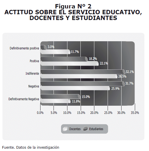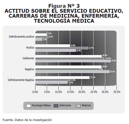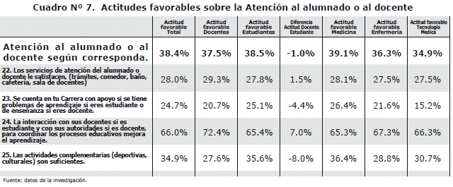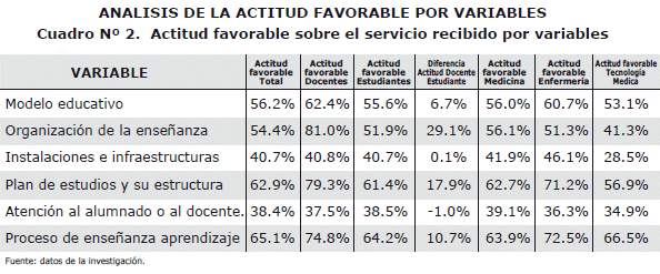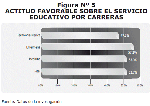 The total favorable attitude was of 52.7%, with the following differences: educational 60.5%, students 52%, medicine 53.3%, infirmary 57.2% and Medical Technology 47.3%. For variable of educational service: a) educational model 56.2%, b) organization of the teaching 54.4%, c) facilities and infrastructure 40.7%, d) plan of studies and its structure 62.9%, e) attention to the student or the educational 38.4%, f) Process of teaching-learning 65.1%.