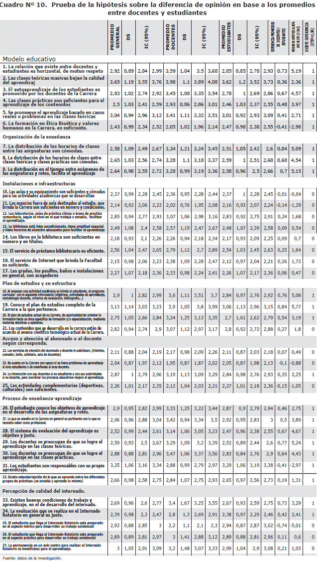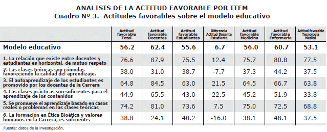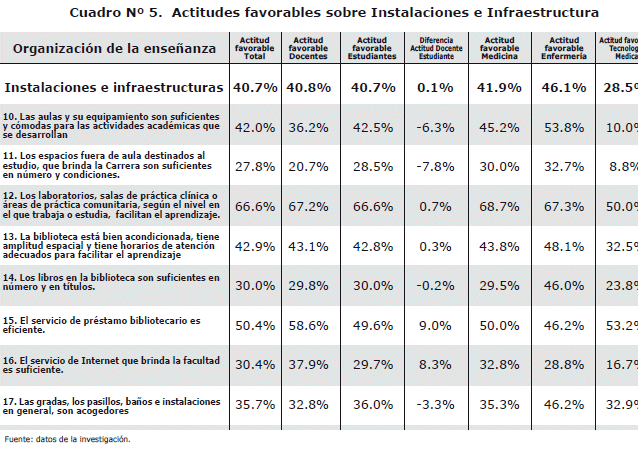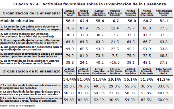 La actitud favorable total fue del 52.7%, con las siguientes diferencias: docentes 60.5%, estudiantes 52%, medicina 53.3%, enfermería 57.2% y Tecnología Medica 47.3%. Por variable de servicio educativo: a) modelo educativo 56.2%, b) organización de la enseñanza 54.4%, c) instalaciones e infraestructura 40.7%, d) plan de estudios y su estructura 62.9%, e) atención al alumnado o al docente 38.4%, f) proceso enseñanza-aprendizaje 65.1%.