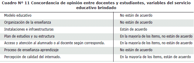 3) La acción administrativa para corregir las desviaciones o los estándares inadecuados. Existe esta intención de trabajo en la facultad, al crear instancias de evaluación y de control de la calidad en la institución. En este estudio se establecieron las actitudes sobre el servicio educativo que brinda la Facultad, la actitud favorable sobre el internado rotatorio de la Carrera de Medicina y se establecieron criterios de diferencia de opinión entre docentes y estudiantes mediante la diferencia porcentual.