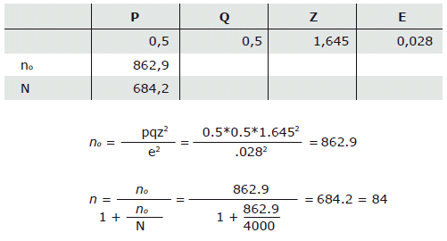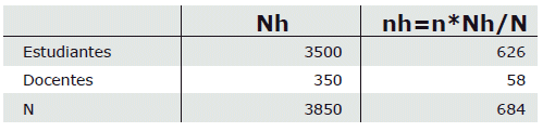 El tamaño de la muestra fue de 684, se calculó de un universo estimado de 3850 estudiantes y docentes, se lo estimó mediante muestreo estratificado por proporciones de la siguiente manera: