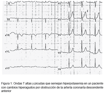 El Potasio tiene un rol importante en la función de las células del organismo. En el corazón, los niveles de potasio intracelular y extracelular son esenciales para la norma! generación y conducción del impulso eléctrico. Trastornos eléctricos que pueden terminar en fibrilación ventricular o asistolia pueden presentarse en pacientes con hiperkalemia severa. Los cambios iniciales en la hiperkalemia se caracterizan por aparición de ondas T picudas, en "tienda de campaña", y acortamiento del intervalo Q-T que refleja una polarización anormalmente rápida. Estas ondas pueden confundirse con las ondas T altas que aparecen en la isquemia miocárdica temprana (subendocárdica). Sin embargo, estas últimas se asocian a un intervalo Q-T prolongado o normal (figura 2 y figura 3).