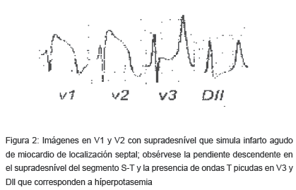 Esta imagen de pseudo IAM, además de estar acompañada por las manifestaciones electrocardiográficas ya descritas en la hiperkalemia (T picuda, QRS ancho, etc), presenta el segmento S-T supradesnivelado con una pendiente descendente que refleja el gradiente eléctrico producido por la despolarización no homogénea de diferentes porciones del míocardio (fígura 3).