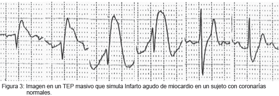 Desde la descripción del patrón clásico S1 Q3 T3, el papel del ECG en el TEP agudo continúa siendo de interés. En la fase aguda del TEP pueden ocurrir diferentes cambios en el ECG. Estos incluyen arritmias, trastornos de conducción, cambios en el eje del QRS, cambios en la morfología de la onda P, del complejo QRS, del segmento ST y de la onda T. Estos cambios son extremadamente variables y con poca sensibilidad y especificidad; el ECG puede resultar normal en 25 a 30 % de los casos. Además; la presencia de enfermedad cardiopulmonar preexistente puede simular los cambios descritos en el TEP, disminuyendo la especificidad de este examen. En el TEP se han descrito cambios electrocardiográficos que pueden simular isquemia anteroseptal (figura 3).