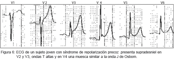 El ECG muestra cambios característicos en la hipotermia que ayudan a un rápido diagnóstico. La onda J de Osborn es el dato más llamativo. Se trata de una imagen similar a una joroba entre el complejo QRS y la parte inicial del segmento S-T (figura 5), es más notoria en las derivaciones que enfrentan al ventrículo izquierdo (V5, V6 , DI y aVL) y la cara inferior del corazón (Dll, Dlll, aVF). La amplitud de la onda J de Osborn disminuye con el recalentamiento y puede persistir 12 a 24 horas después de la restauración de la temperatura corporal. La onda J es causada por un importante gradiente transmural de voltaje mellado en el epicardio pero no en el endocardio. Esta melladura en el potencial de acción se explica por una corriente de potasio más prolongada en el epicardio que en el endocardio.