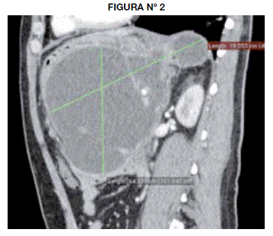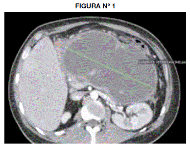 En la tomografía se observa una colección líquida multilobulada de aspecto homogéneo (10.8 UH) y baja densidad, de 2795cc de volumen calculado (19.18 X 19.55 X14.33cm) localizada en el saco menor (entre la pared posterior del cuerpo gástrico y el páncreas) y con extensiones a los espacios gastro-esplénico y subfrénico izquierdo contactando la fascia pararrenal anterior. Tiene paredes definidas con espesor máximo de 4.8mm.(Fig 1, Fig 2).