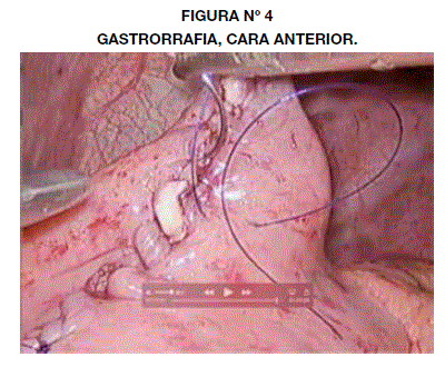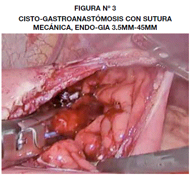 Con base en los hallazgos anteriores y los antecedentes clínicos y quirúrgicos se optó en primera instancia por el drenaje endoscópico, con colocación de catéter cola de cochino (pig tale), sin embargo ésta fue fallida, en parte a que no se cuenta con ultrasonido endoscópico en la unidad y por no haber un área adecuado para la punción, de acuerdo al reporte del servicio de endoscopía. Motivo por el que se decide realizar el drenaje por vía laparoscópica. Se procede a colocación del paciente en posición francesa y se ingresa a cavidad con técnica abierta con un total de 4 trocares de trabajo. Gastrotomía en cara anterior a nivel del cuerpo gástrico, de 5 cm aproximadamente. Realizamos punción en cara posterior del estómago con salida de abundante líquido turbio, obscuro. En este lugar se realiza nueva gastrotomía de pared posterior con bisturí armónico hasta comunicar el pseudoquiste pancreático, una vez realizada una ventana de aproximadamente 1 cm, se introduce a través de los mismos una engrapadora lineal de 4.5cm (endogia) y realizamos la anastomosis con sutura mecánica, amplia (Fig. 3). Se marsupializa con sutura prolene 2-0, brecha de entrada de la anastomosis. Colocamos sonda naso gástrica dentro del pseudoquiste. Gastrorrafia de cara anterior con polidioxanoma 3/0, colocación de drenaje laminar en cavidad. (Fig.4) Concluye acto operatorio sin complicaciones.